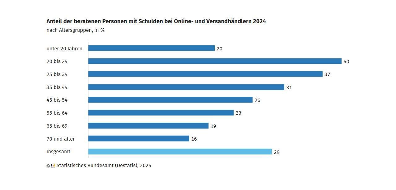 Im Jahr 2024 suchten laut Destatis etwa 577 400 Personen in Deutschland Hilfe bei Schuldnerberatungsstellen. Bei 29 % bestanden offene Zahlungsverpflichtungen gegenüber Online- und Versandhändlern, zwei Prozentpunkte mehr als 2019. Die durchschnittliche Schuld in diesem Bereich betrug 644 Euro. Die durchschnittliche Gesamtverschuldung belief sich hingegen auf 32 976 Euro, wodurch Forderungen im E-Commerce lediglich zwei Prozent der Gesamtfinanzlast darstellen und somit relativ unbedeutend bleiben.